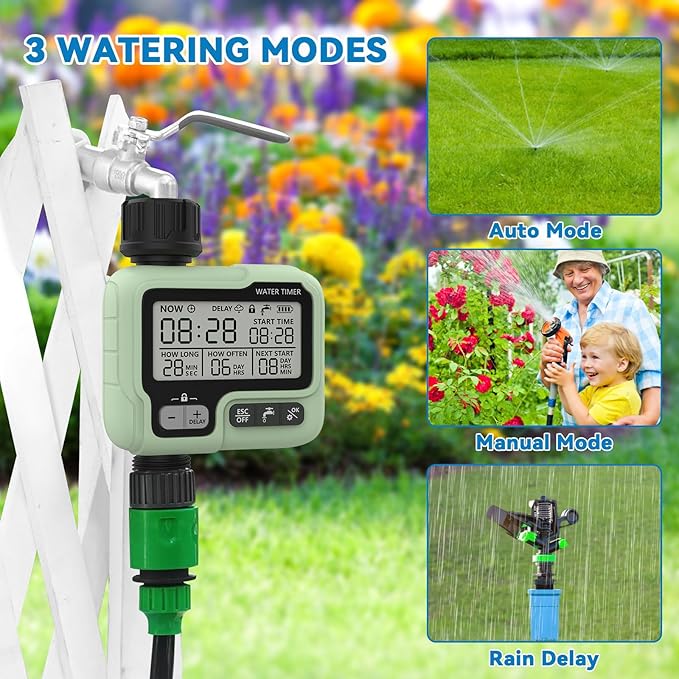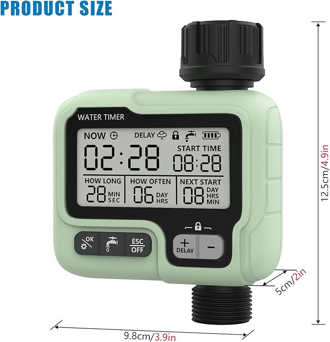 Equipped with a 3-inch LCD display, this timer makes programming simple and clear. It shows battery life and all settings at a glance, and the screen automatically sleeps after 30 seconds to save power.
